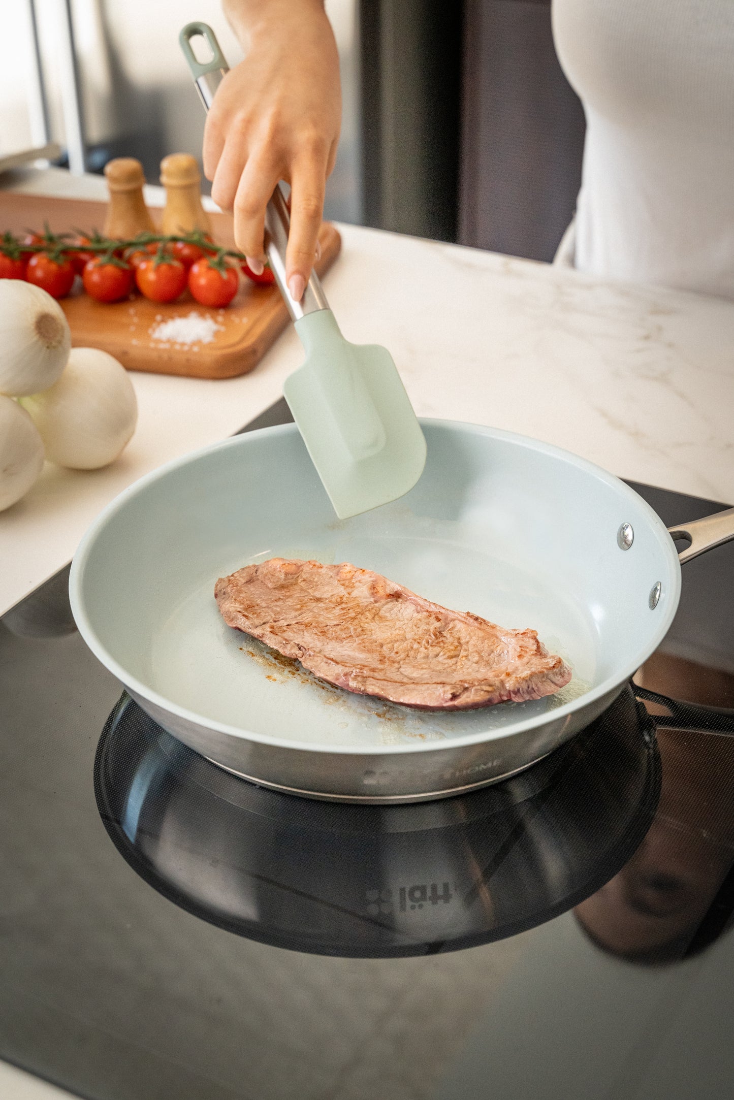 COCCIÓN UNIFORME: Gracias a su fondo Full Induction de 5 capas, nuestra sartén distribuye el calor de forma homogénea y constante, sin puntos fríos. Esto permite cocinar de manera más eficiente, conservando mejor los jugos, aromas y propiedades de cada alimento. Ideal para cocciones lentas, salteados controlados y platos que requieren precisión térmica.