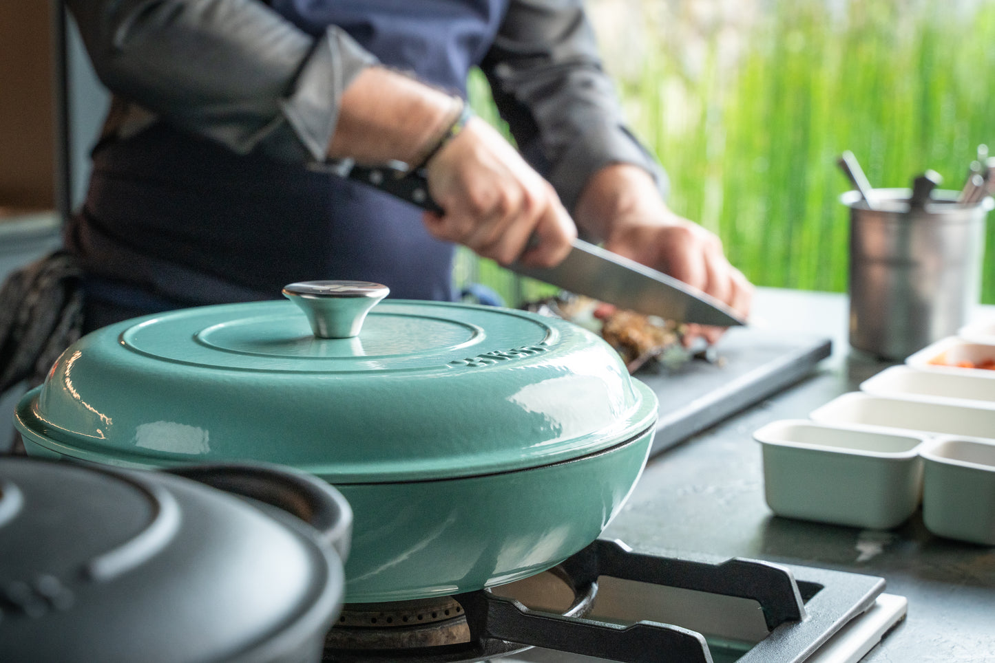 El pomo de acero inoxidable, además de ser elegante, es resistente al calor, lo que te permite manipular la cocotte con seguridad y facilidad en todo momento.